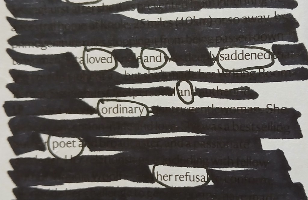 Stepping here as if her life like scents floating in from birdsong was one loved and saddened; an ordinary poet, her refusal to to think of textures that feel unique … Continue reading Day Eleven: Space (Erasure / Blackout Poem)