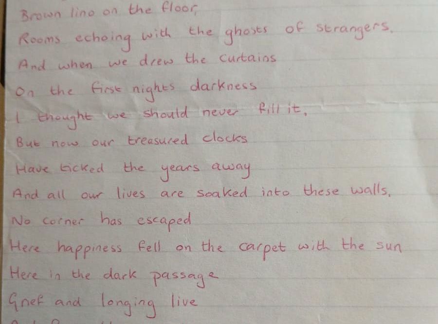 Three days into my grief, I find it – a poem. You felt it important to copy out in your notebook, small curling letters, red pen. It spoke of love … Continue reading Poem